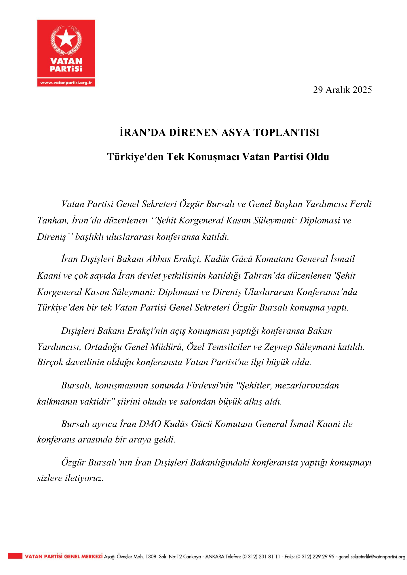 İran Dışişleri Bakanı Abbas Erakçi, Kudüs Gücü Komutanı General İsmail Kaani ve çok sayıda İran devlet yetkilisinin katıldığı Tahran’da düzenlenen 'Şehit Korgeneral Kasım Süleymani: Diplomasi ve Direniş Uluslararası Konferansı’nda Türkiye’den bir tek Vatan Partisi Genel Sekreteri Özgür Bursalı konuşma yaptı.