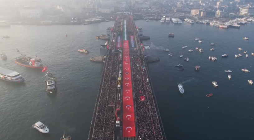 İstanbul’da yeni yılın ilk sabahında binlerce kişi Galata Köprüsü’nde Gazze’ye destek için bir araya geldi. Köprü üzerinde yoğun kalabalık oluşurken, etkinlik alanında Filistin bayrakları ve pankartlar dikkat çekti.